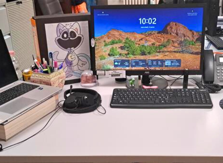 La scrivania di Altomare, capo reparto della Linea 2, racconta due mondi. Tra i monitor spunta il disegno di suo figlio Kevin, un promemoria quotidiano di ciò che si costruisce fuori dall’azienda.